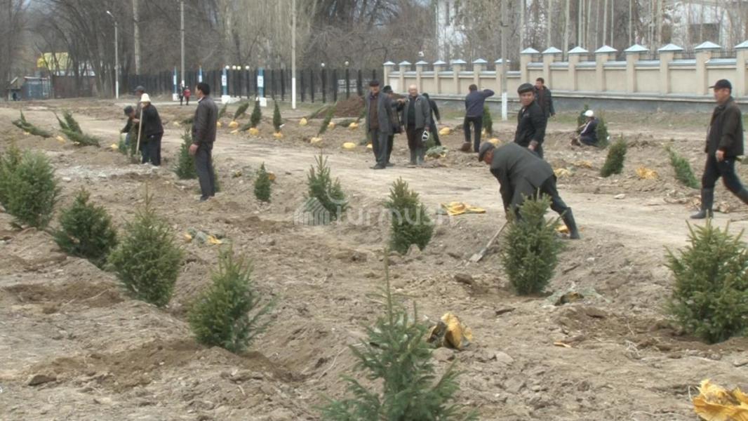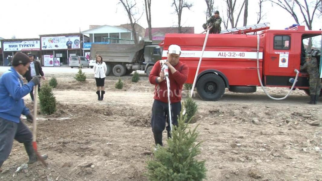 В селе Кара-Буура Таласской области вместо старых деревьев, которых посадили в 1970 году, посадили новые саженцы тянь-шаньских елей (фото)